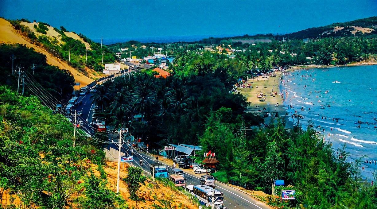 Con đường từ đồi cát bay (đồi cát đỏ) chạy xuống biển Hòn Rơm, là một trong những cung đường biển đẹp nhất của Mũi Né. Với một bên là những đồi cát đỏ, một bên là bãi biển dài xanh biếc. Đây là địa điểm của rất nhiều du khách dừng lại chụp ảnh check in. Đặt biệt là khách đi tour xe jeep Mũi Né. Nếu các bạn có đi ngang qua đây thì nhớ nói bác tài dừng lại để check in nhé:)