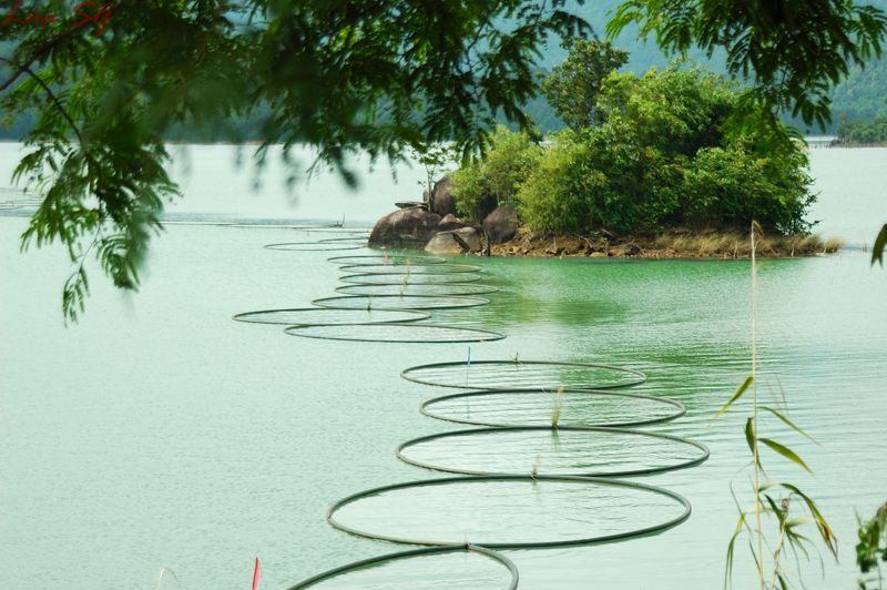 Trên mặt hồ có màu xanh như ngọc ấy thi thoảng bạn sẽ thấy sự xuất hiện của một vài cù lao có màu vàng nâu, trông xa xa giống như những hòn đảo nhỏ mọc giữa biển cả mênh mông. Khung cảnh này làm nhiều người liên tưởng đến kiệt tác thiên nhiên tại Vịnh Hạ Long ở miền Bắc.